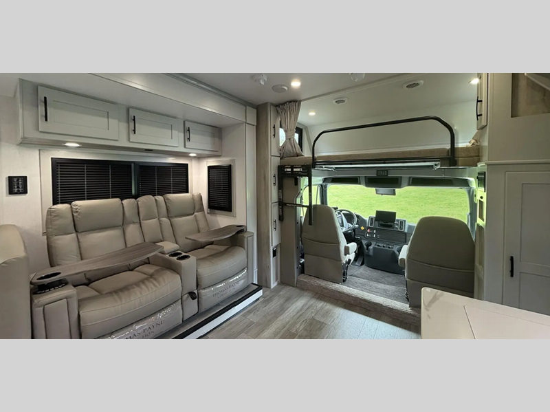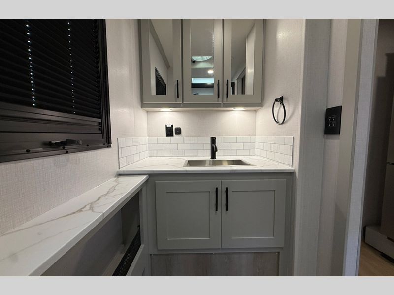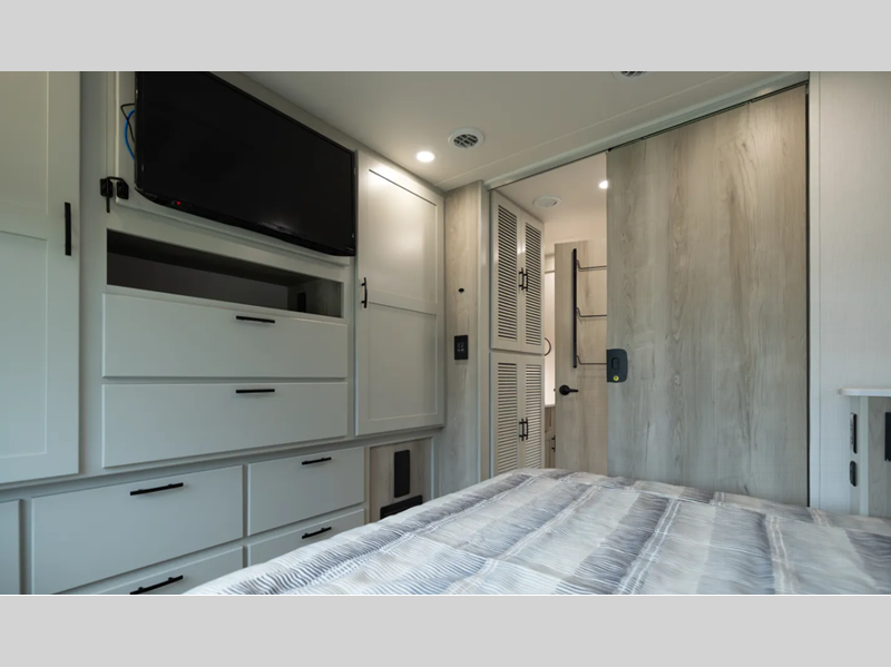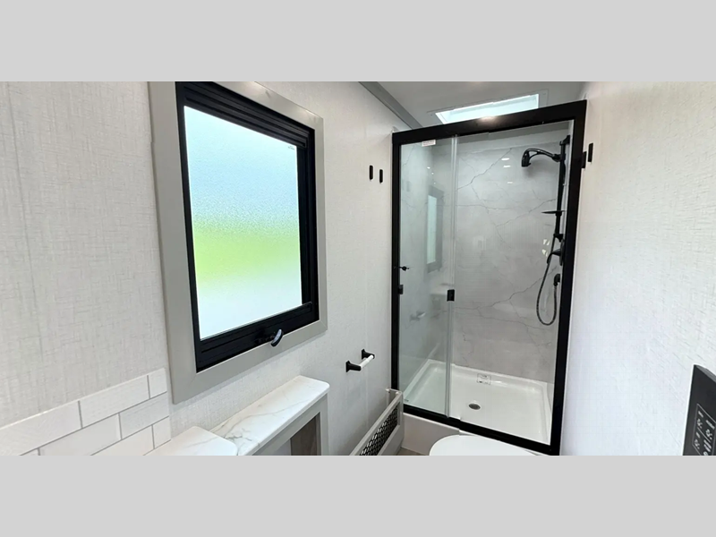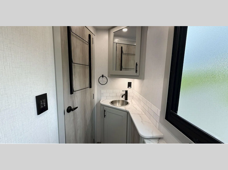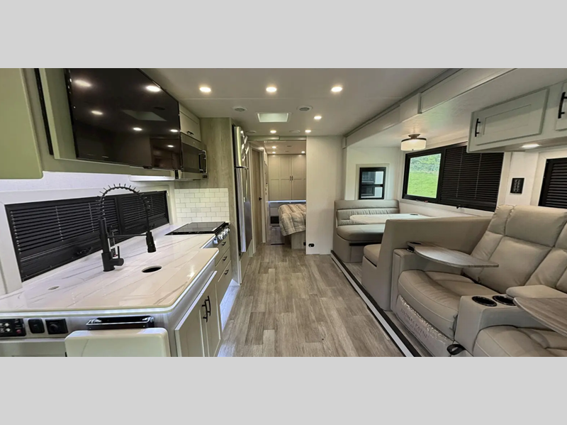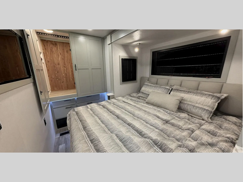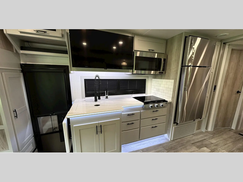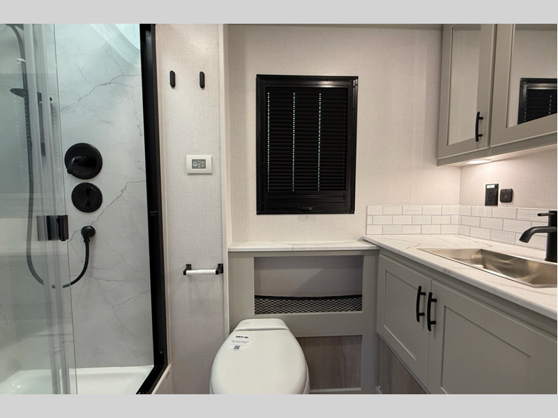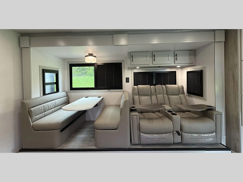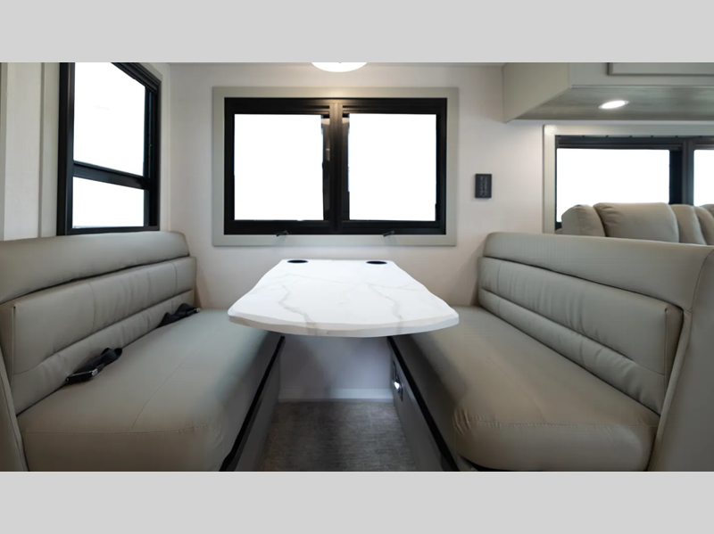 You will love the convenient amenities that have been included, like the multiplex wiring with a touch screen command center, the on-demand water heater, and the maintenance-free house battery with a single 200W solar panel to go off-grid when you choose. Inside, you'll find leatherette captain's seats with air ride, solid surface countertops with LED edge lighting, hardwood shaker-style cabinetry, and many more luxuries.