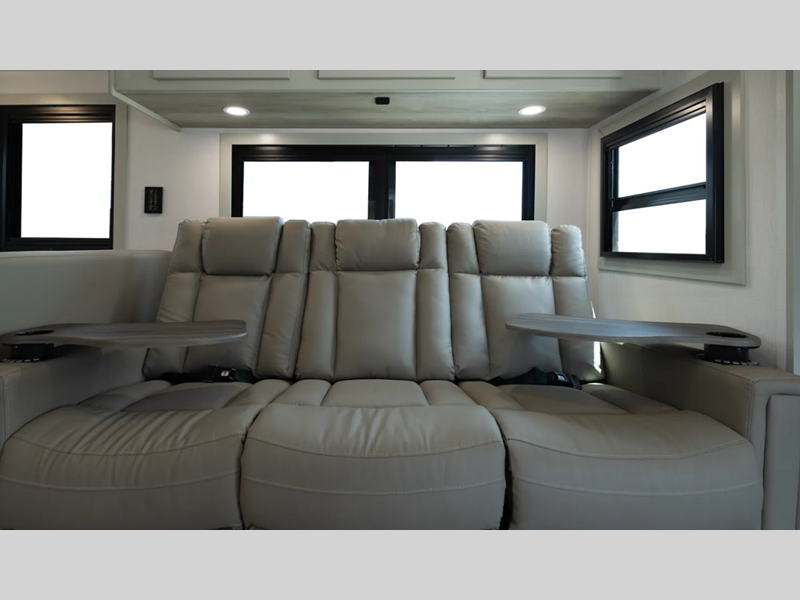 Sleeps 5 Slides 2 Length 36 ft 8 in Ext Width 8 ft 5 in Ext Height 12 ft 9 in Interior Color Driftwood II, Mindful Gray, Milano II, Saddle, Desert (Dealer Stock Only) Exterior Color Full Body Paint; Admiral Blue, Khaki, Quicksilver, Stone Ridge Hitch Weight 15000 lbs GVWR 33000 lbs Fresh Water Capacity 94 gals Grey Water Capacity 52 gals Black Water Capacity 52 gals Tire Size 275/80R 22.5 Furnace BTU 40000 btu Generator 8kW Onan Diesel Fuel Type Diesel Engine Cummins B6.7 Turbo Diesel Chassis Freightliner M2 106B Plus Horsepower 360 hp Fuel Capacity 100 gals Wheelbase 268 in Available Beds King Torque 800 ft-lb Refrigerator Type 12V Three Door Compressor Driven Refrigerator Size 15 cu ft Convection Cooking Yes Cooktop Burners 3 Number of Awnings 1 Axle Weight Front 12000 lbs Axle Weight Rear 21000 lbs LP Tank Capacity 20.3 gals Water Heater Type On Demand LP AC BTU 30000 btu TV Info LR 39" LED Smart TV, BR 32" LED Smart TV Awning Info 16' Armless w/LED Lighting and Motion Activated Retraction Washer/Dryer Available Yes Gross Combined Weight 46000 lbs Shower Type Standard Electrical Service 50 amp Solar Wattage 200 watts Similar Floorplans