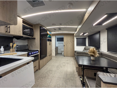 Each of these includes exceptional features, like a 200W roof-mounted solar panel, high-capacity furnace, residential cabinetry, spare tire & carrier, and a universal docking station. Additionally, you'll have accommodating features scattered all throughout the trailer with the upgraded residential furniture in the interior, the solid surface countertops in the kitchen, motion sensor entry LED lighting, and the large panoramic windows in the interior. The aluminum framed fully laminated sidewalls and enclosed underbelly with suspended tanks will hold them up for your adventures on the road!